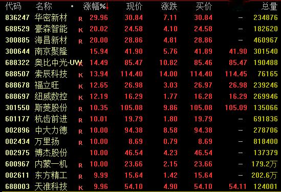 场内超3300股飘红,人形机器人概念活跃,豪森智能、华密新材等涨停,中大力德再创新高;军工板块再度爆发,北方长龙、长城军工涨停,双双续创历史新高;船舶板块崛起,中国重工、中国船舶涨停;医药板块疲弱,奇正藏药连续两日跌停,翰宇药业跌近9%;此外,近期的大牛股上纬新材尾盘跌停。