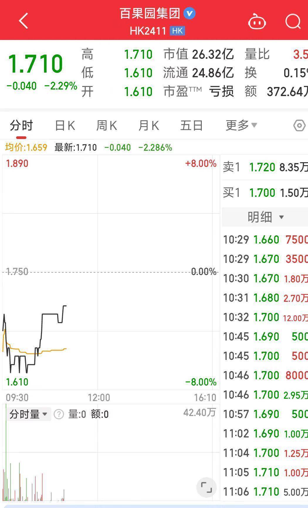 因“教育消费者成熟”“不会迎合消费者”等言论引发争议后中国股票网,8月11日,百果园盘中一度跌8%,报1.61港元。截至发稿,百果园报1.71港元/股,跌2.29%。