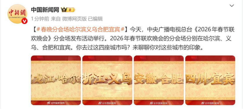 发布活动上官宣了2026年春晚分会场:哈尔滨、义乌、合肥、宜宾。